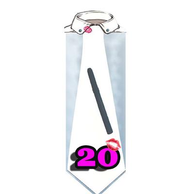 Cette cravate satinée blanche spéciale 20 ans mesurant 60 cm de long et plus de 20 cm de large sur le bas se fixera autour du col ou du cou par un élastique ; elle est imprimée avec un 20 en rose et son bisou.