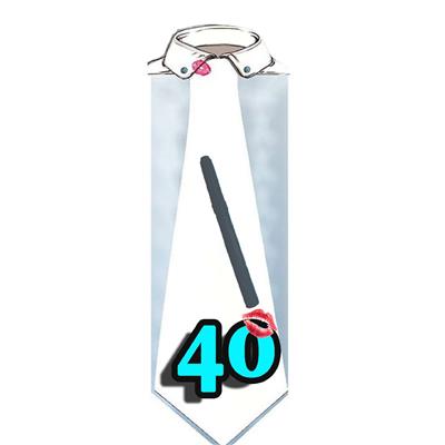 Cette cravate satinée blanche spéciale 40 ans mesurant 60 cm de long et plus de 20 cm de large sur le bas se fixera autour du col ou du cou par un élastique ; elle est imprimée avec un 40 en bleu et son bisou.