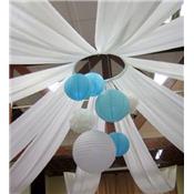 Une imposante collection de décoration à suspendre comme des cœurs alvéolés, boules fleurs à suspendre, papier crépon, lampions, rouleaux de tenture pour la déco plafond du mariage, guirlandes et autres banderoles procureront une sensation de convivialité et coloreront votre salle avec beaucoup de relief.