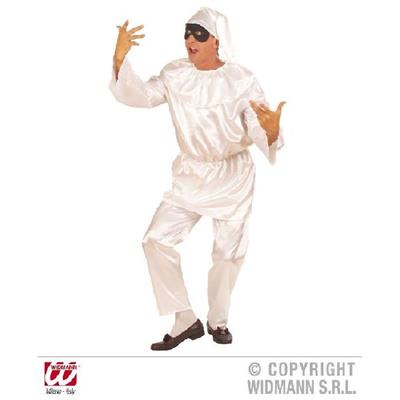 Ce déguisement de polichinelle en satin blanc comprenant la chemise,pantalon et bonnet conviendra à un homme portant une taille L (42/44).
